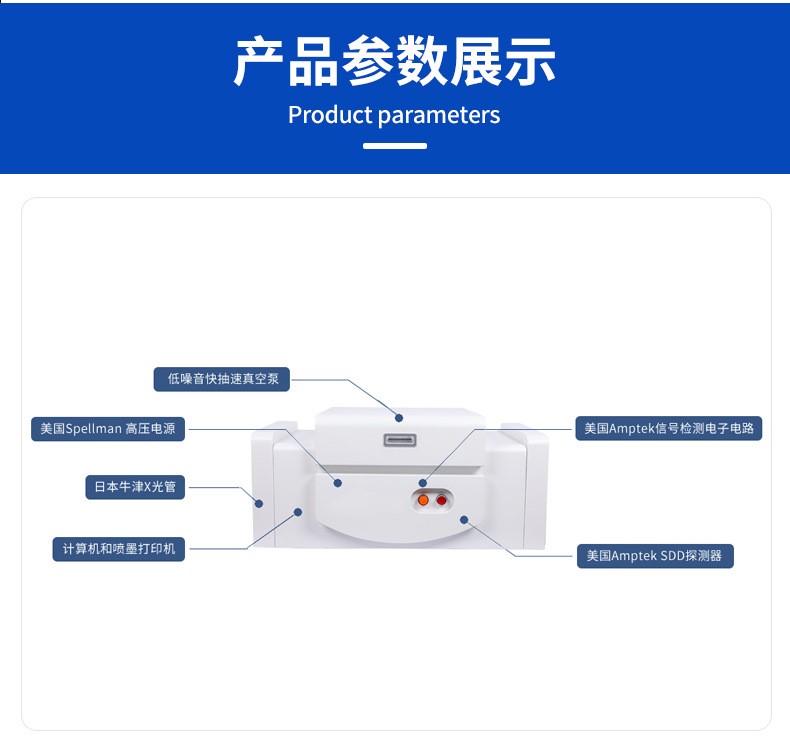 探测器: 美国Amptek 高灵敏度探测器,最佳分辨率:149±5eV。 | |||||
