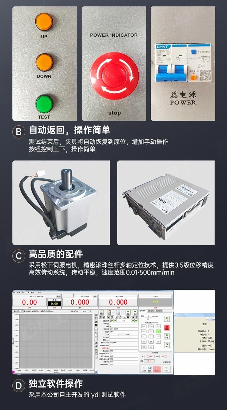 采用进口光电编码器进行位移测量,控制器采用嵌入式单片微机结构,内置功能强大的测控软件,集测量、控制、计算、存储功能于一体。具有自动计算应力、延伸率(需加配引伸计)、抗拉强度、弹性模量的功能,自动统计结果;自动记录*大点、断裂点、定点的力值或伸长量;采用计算机进行试验过程及试验曲线的动态显示,并进行数据处理,试验结束后可通过图形处理模块对曲线放大进行数据再分析编辑,并可打印报表,产品性能达到******。