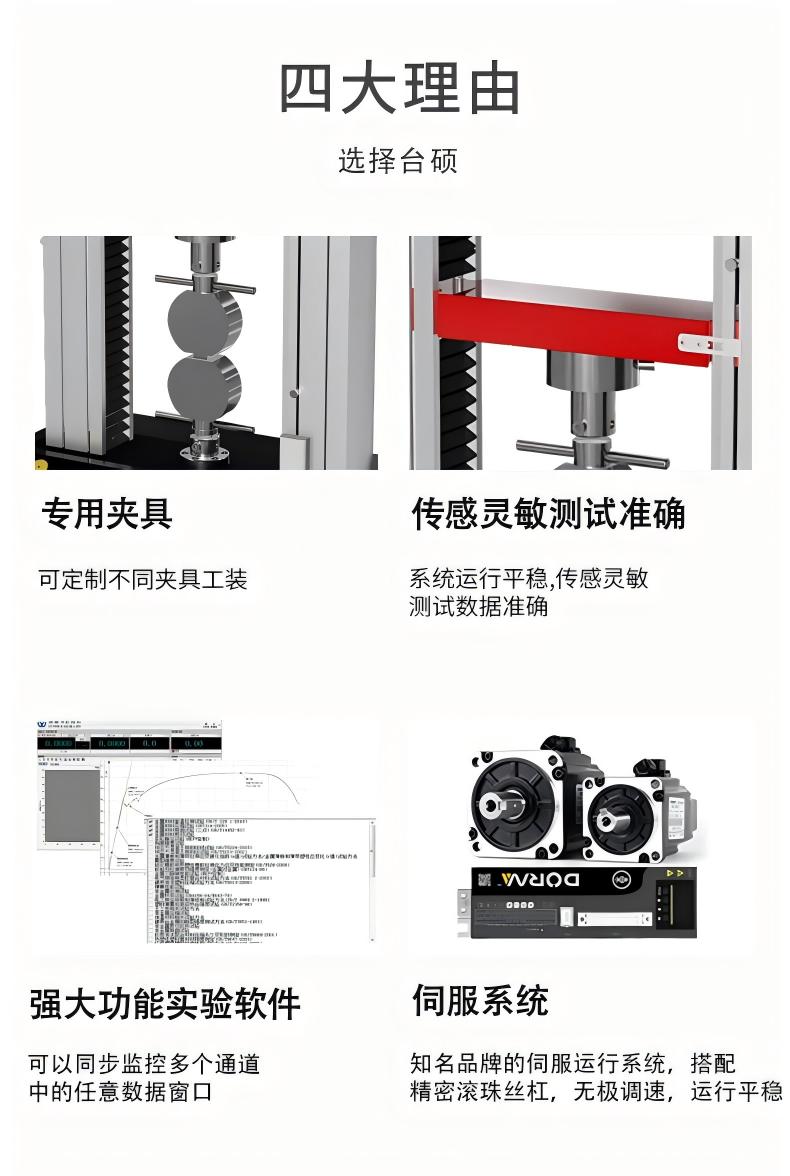 万能材料试验机测试过程中采用数字化控制,采用中国台湾马达及中国台湾台达变频器控制系统,配合中国台湾VGM蜗轮减速箱及中国