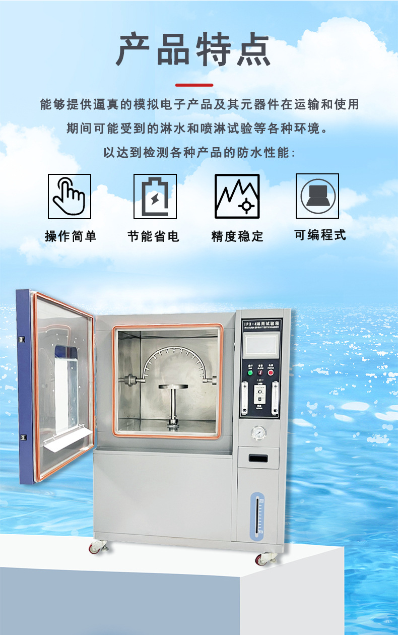 IPX5、IPX6防水测试装置主要是测试产品在暴雨的气候环境下的贮存、运输和使用时的性能,主要适用于户外照明、室外灯具、汽车灯具、家用电器、电工电气、通讯产品及信号装置等产品做外壳防护等级测试(IP防水等级试验),专用于防水保护等级的检测设备,是专业检测机构理想的试验装置,以及相等效的其他水试验方法