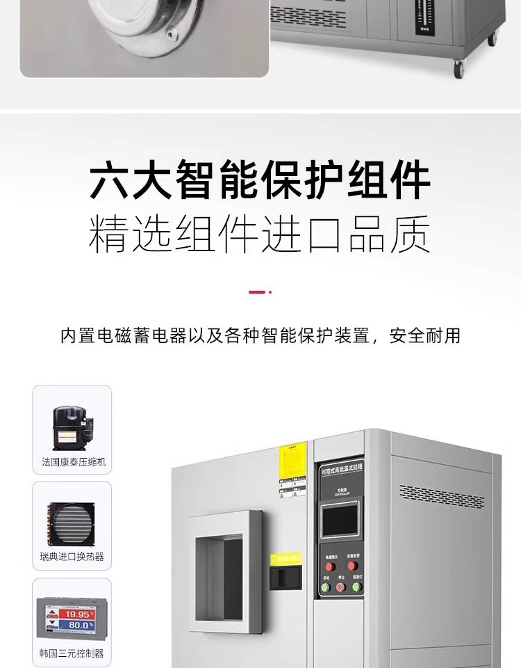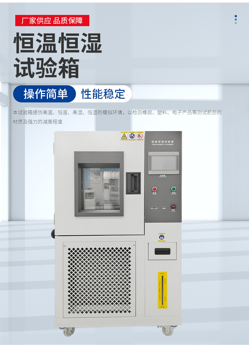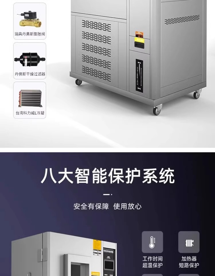 符合温湿度测试标准风循环系统,可模拟高温低温、低温高温等不同环境的测试条件,搭配容易操作和学习的高准确性编程系统,广泛适用于电工、电子、仪器仪表及其它产品零部件在高低温湿热环境下贮存、运输、使用时的适应性试验,确定上述产品对高低温及湿热环境的耐温适应性,特别是产品电气性能和机械性能的变化情况 也可用于检查试样耐受某些腐蚀的能力