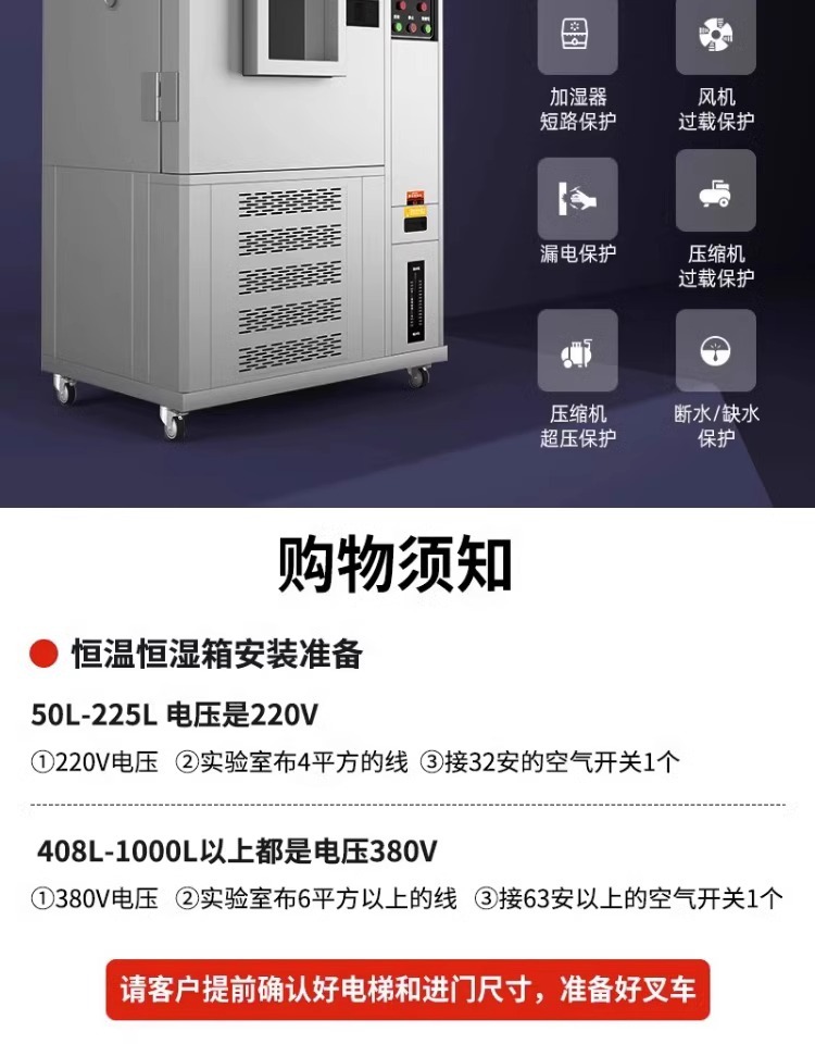 试验箱配有两块不锈钢条状搁板高度可移动搁条