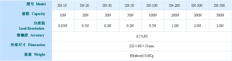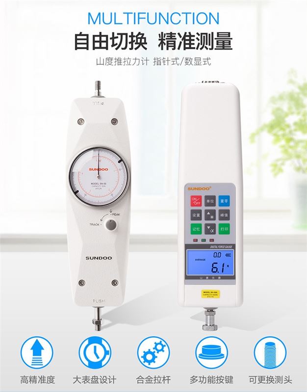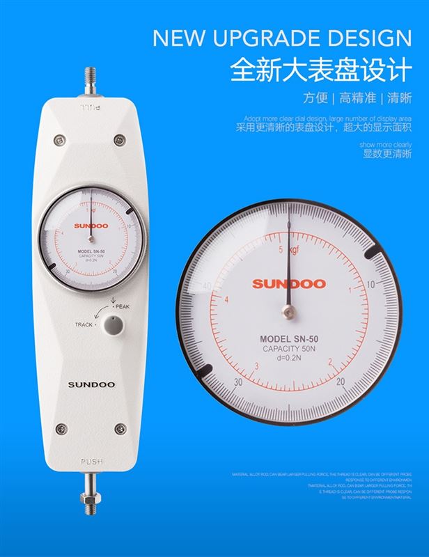 SN系列推拉力计是小型简便的推力、拉力测试仪器,具有高精度、易操作及携带方便之优点,而且有一个峰值切换操作旋钮,可做荷重峰值指示及连续荷重值指示。适用于电子电器、轻工纺织、建筑五金、打火机及点火装置、消防器材、制笔、制锁、渔具、动力机械、科研机构等行业的推拉负荷测试,是代替管形推拉力计的新一代产品。