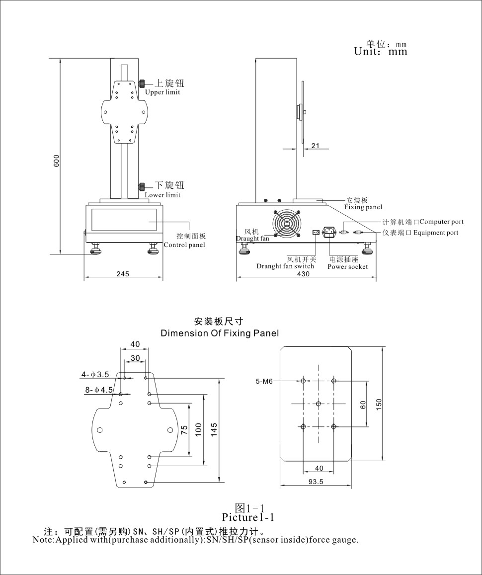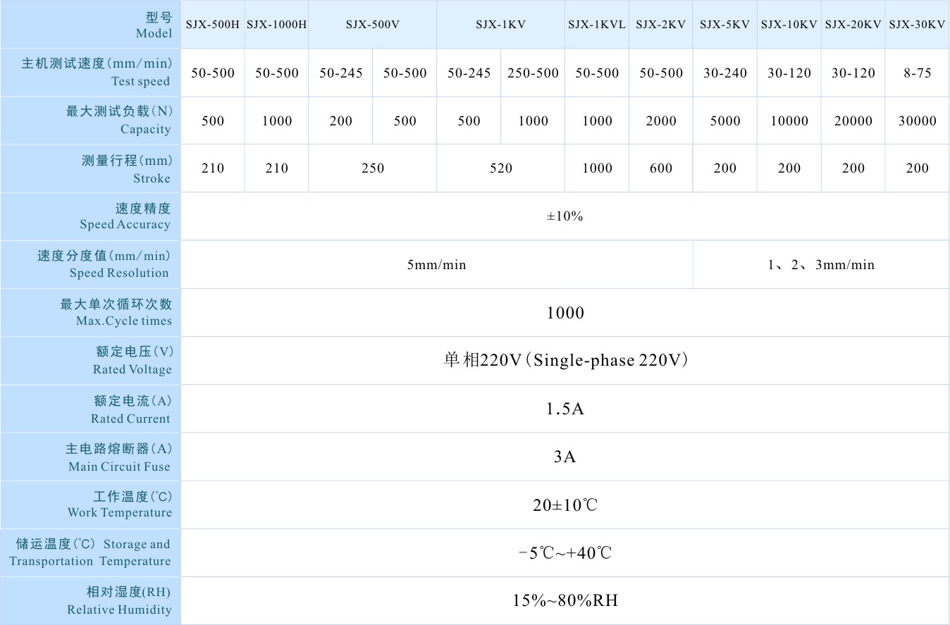 SJX-500V电动立式机台具有稳定性好,适用范围广,使用方便等优点,并具有无极调速,手动(点动)、自动循环控制切换功能。配备推拉力计,适用于橡胶塑料、轻工纺织、建筑门窗、复合材料、电线电缆、汽车配件、动力机械、科研机构等行业的拉压负荷,插拔力,破坏试验等测试。