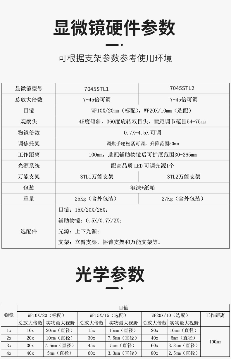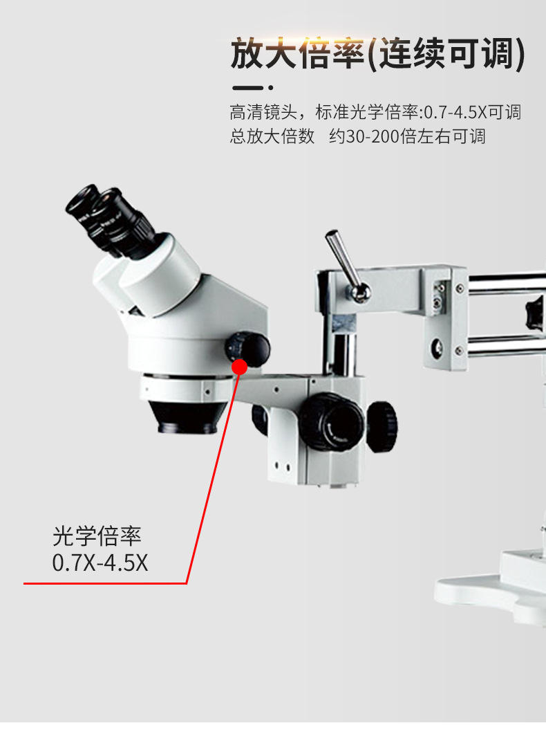 标准放大倍率7X~45X;选配辅助物镜,放大倍率3.5X~180X。