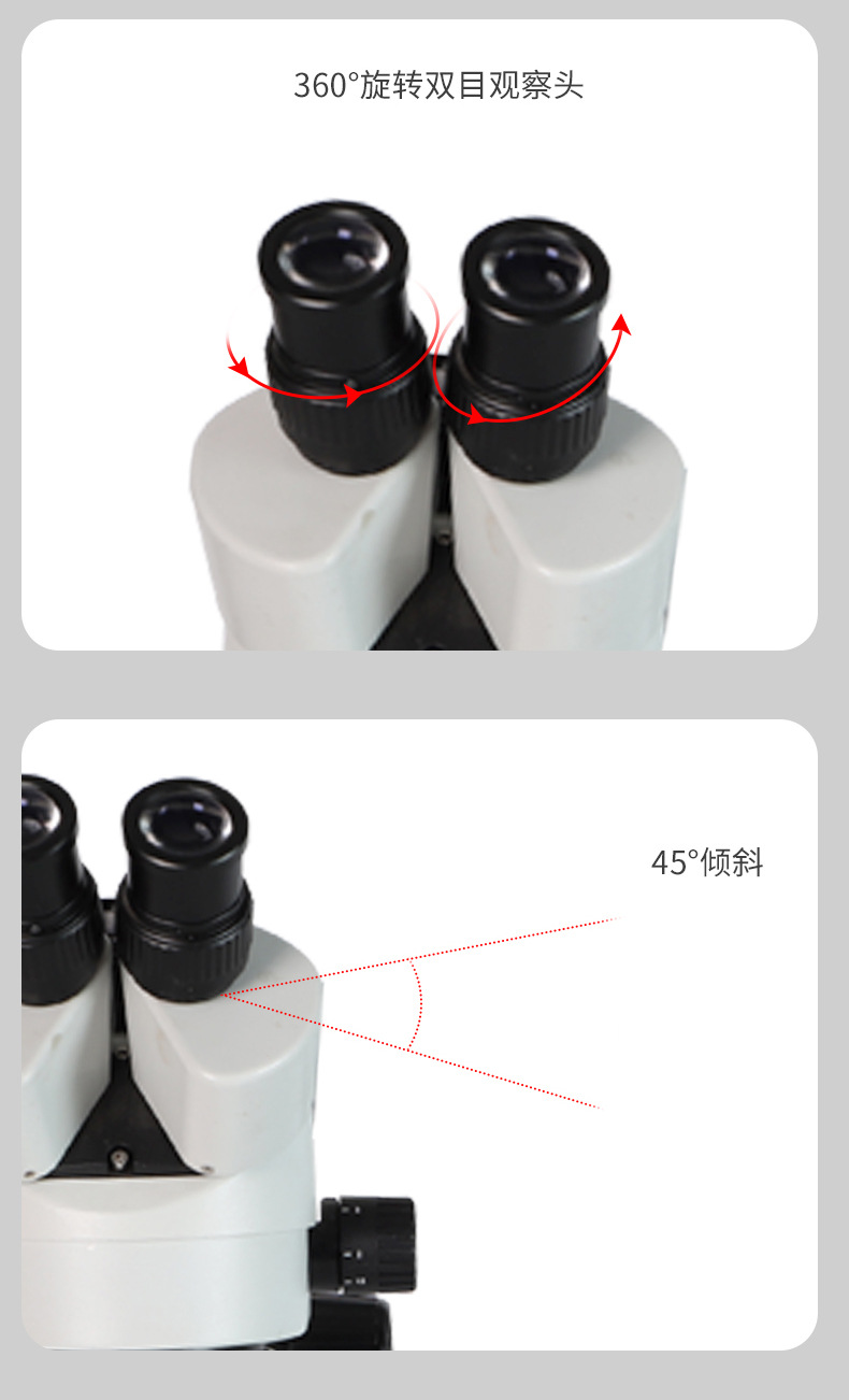 【观察镜筒】 铰链三目,45°倾斜,瞳间距55-75mm;