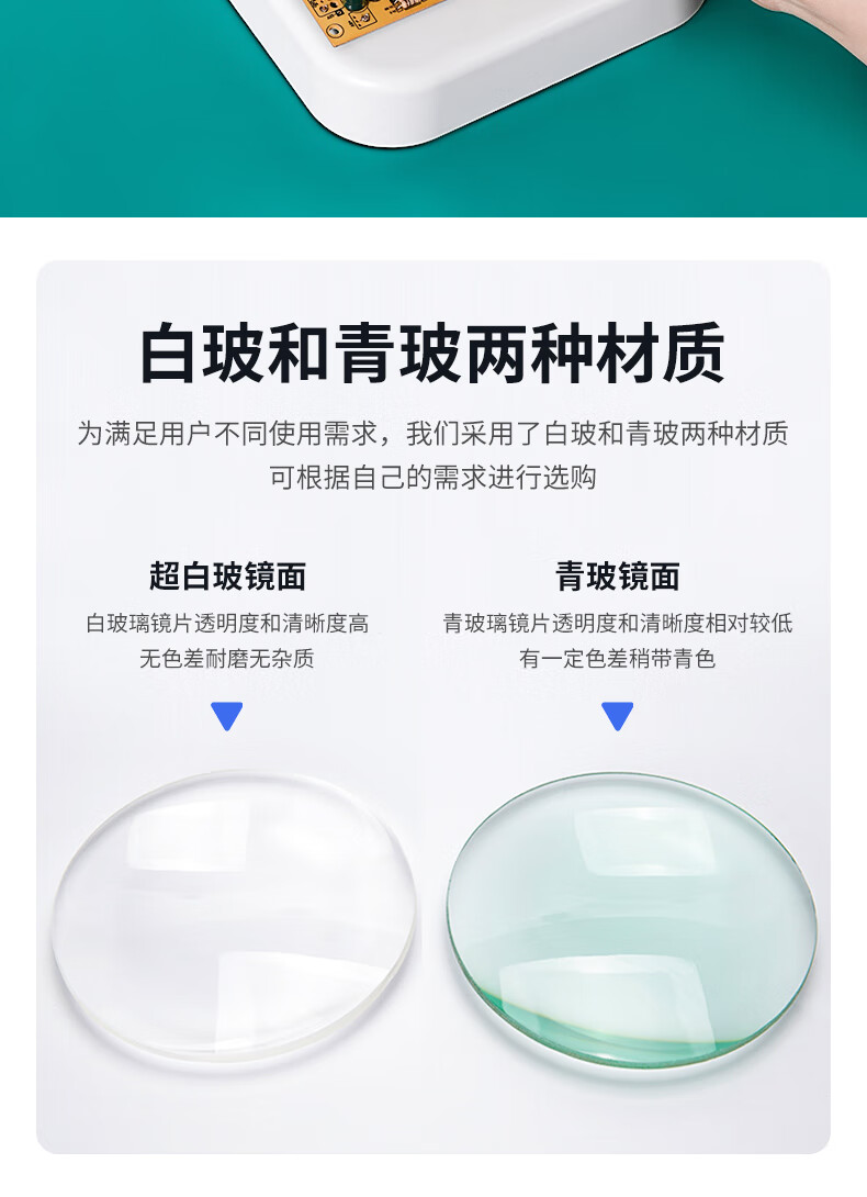 以上图片为圆形的白玻(即光学镜片)与青玻(普通镜片)的区别,具体表现为清晰度不同。光学镜片是高纯度的玻璃,所以清晰度高很多。