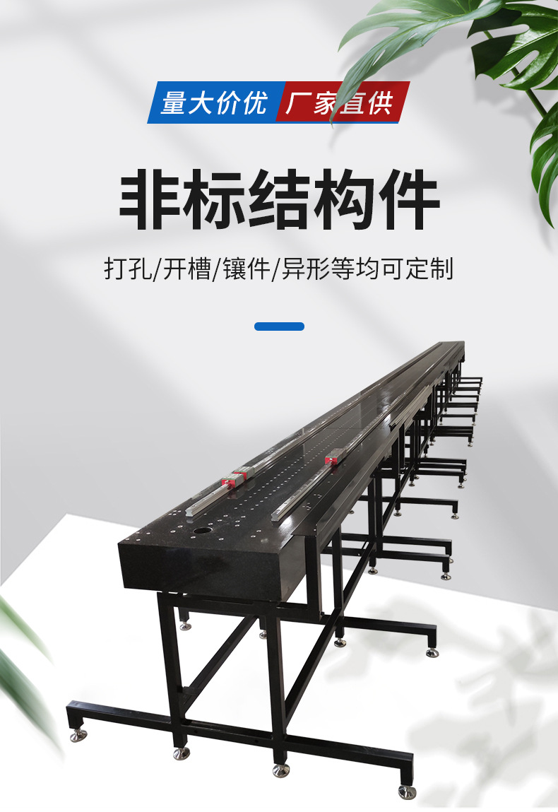5、大理石构件的特点抗磨蚀,耐高温,维护。 物理性稳定,组织缜密,受撞击晶粒脱落,表面不起毛边,不影响其平面精度花岗石精密测量平板。岩石经长期天然时效,组织结构均匀,线胀系数极小,内应力消失,不变形。
