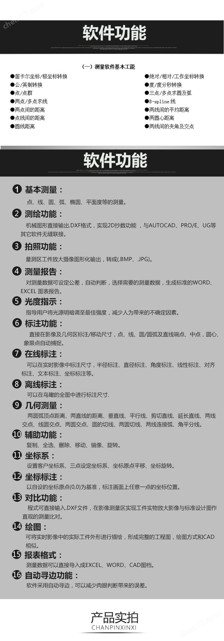 闪测影像仪不仅凝聚了影像检测领域的多项技术成果,而且还融入了快速闪测的创新检测理念,测量时,仅需一键即可实现快速测量、自动判定OK/NG。是影像测量仪的一种,由高解析度CCD彩色镜头、连续变倍物镜、彩色显示器、视频十字线显示器、精密光栅尺、多功能数据处理器、数据测量软件与高精密工作台结构组成的高精度光学影像测量仪器。手动系列影像测量仪较适用于种类多、小批量的产品检测。