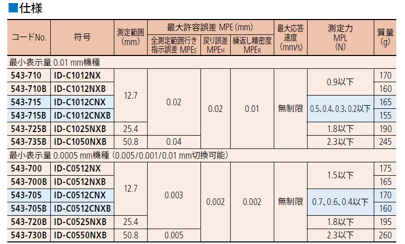 543-700 | ID-C0512NX | 12.7 | 0.0005/0.001/0.01mm (可切换) | 1.5以下 | 175 |