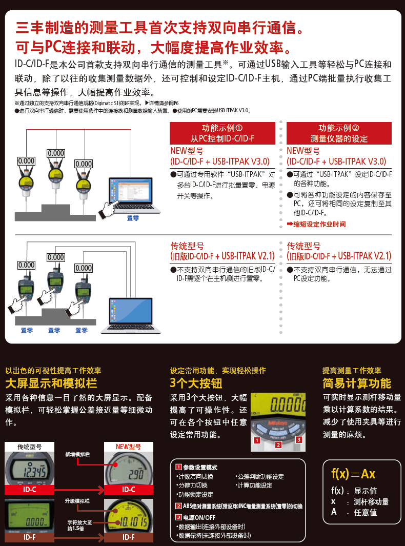 5提高测量工作效率简易计算功能可实时显示测杆移动量乘以计算系数的结果。减少了使用夹具等进行测量的麻烦。