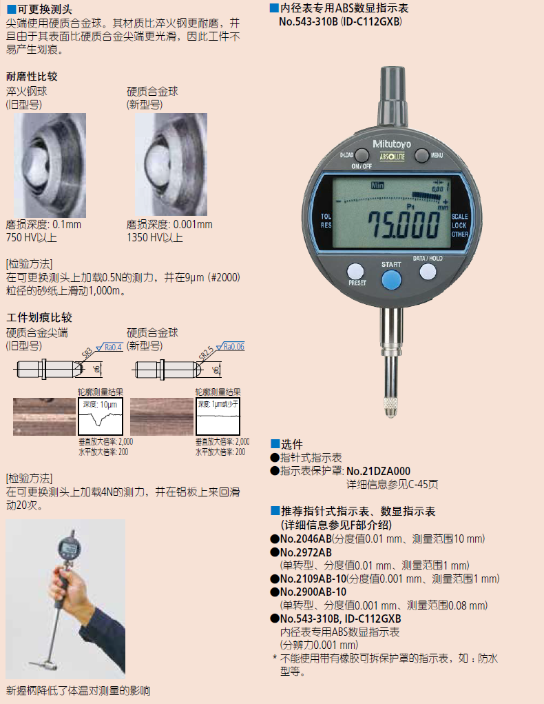 ● 握柄为中空结构,操作者手部热传导引起的指示表变化值有效降低约50%,保证了高精度测量。