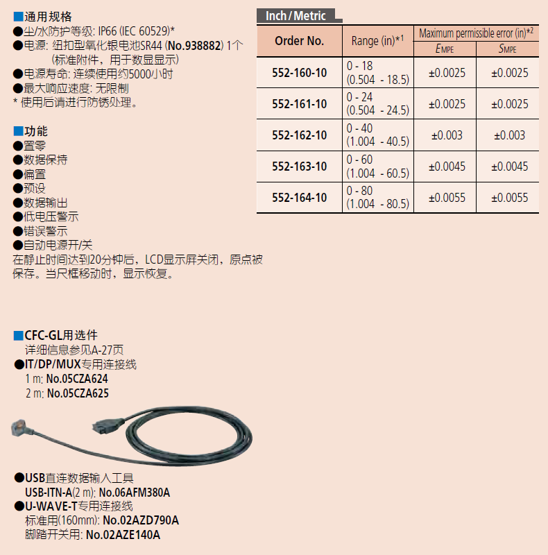 原点设置、调零、预置、偏置、数据保持、自动电源开关、数据输出、英制/公制转换(英制/公制型)