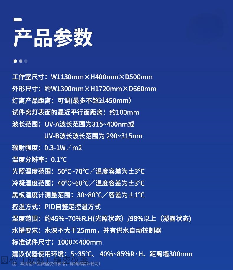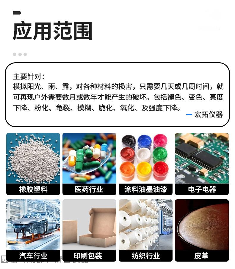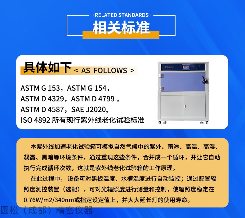 1、GB/T14522-2008机械工业产品用塑料,涂料,橡胶材料人工气候老化使用方法 2、GB/T16585-1996硫化橡胶人工气候老化(荧光紫外灯)试验方法 3、 GB/T16422.3-2014实验室光源暴露试验方法 第2部分:荧光紫外灯 |