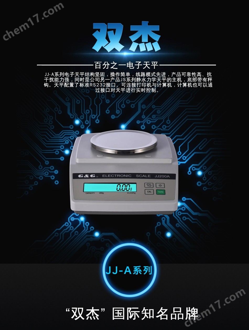 JJ-A系列电子天平结构坚固,操作简单,线路模式优良,产品可靠性高、抗干扰性能力强,同时是公司另一系列JS静水力学天平的主机,底部带有秤钩。天平配置了标准RS232接口,可连接打印机与计算机,计算机也可以通过接口对天平进行实时的控制。