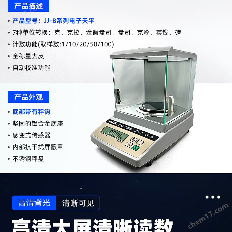 高精度传感器、缜密的电路以及经过改良的微处理器和控制系统构成了JJ-B系列电子天平。天平整体结构坚固、操作简单,产品精确到毫克,满足了绝大多数用户的需求。此外,天平的底部带有秤钩功能,为天平的称重应用提供了更大的灵活性。