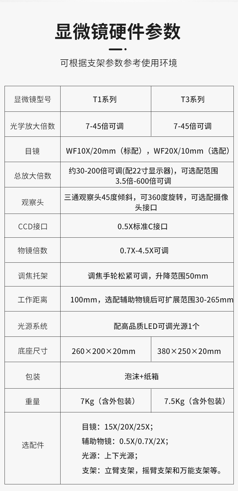 灯源 | 5W LED 灯源箱,LED 色温 5000-5500K,工作电压 100-220VAC/50-60HZ,输出 12V,外形尺寸 270×100×130mm。单光纤软管(长 500mm) |