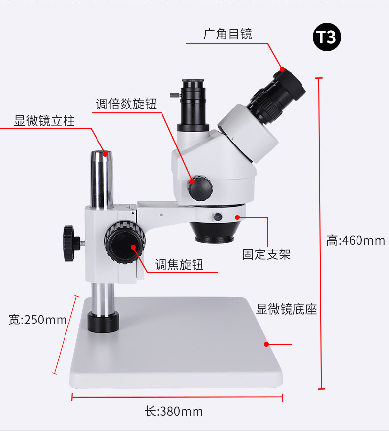 三通观察头,30°倾斜,固定式分光比(双目 :三目 =50:50),瞳距调节范围 50-76mm,固定式目镜筒,带目镜锁紧装置 | |