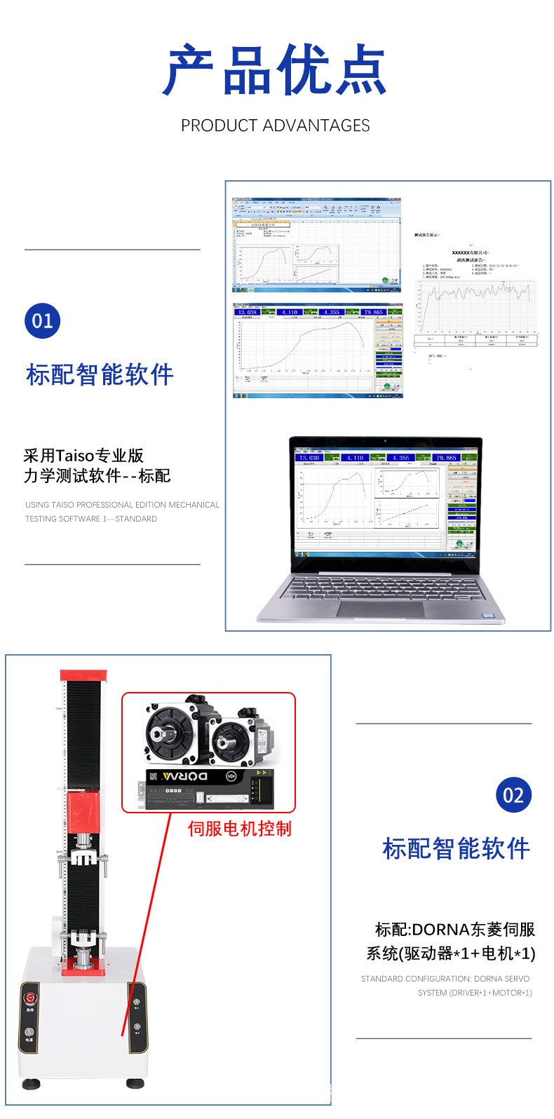 伺服电脑式桌上型拉力试验机测试过程中采用全数字化力量、位移、速度三闭环控制,采用中国台湾交流伺服马达及控制驱动系统,配合中国台湾精密蜗轮减速箱及中国台湾TBI精密滚珠丝杆传动,以达到传动效率与性噪比*效果。