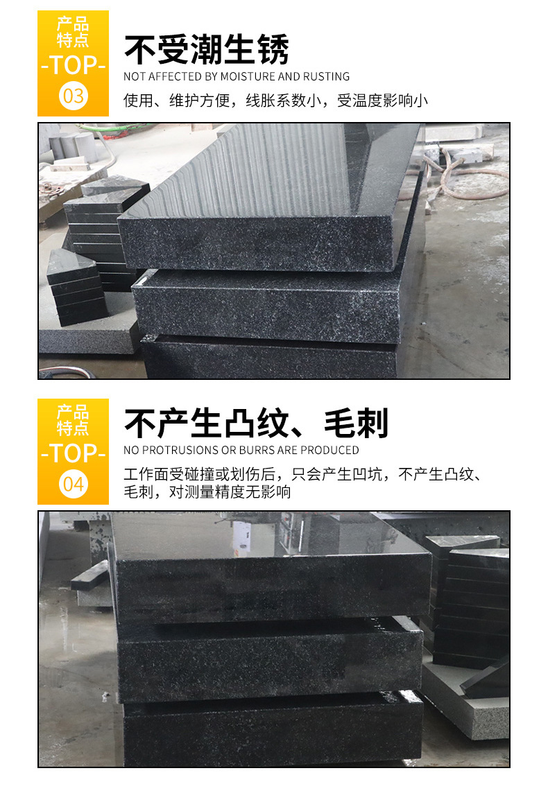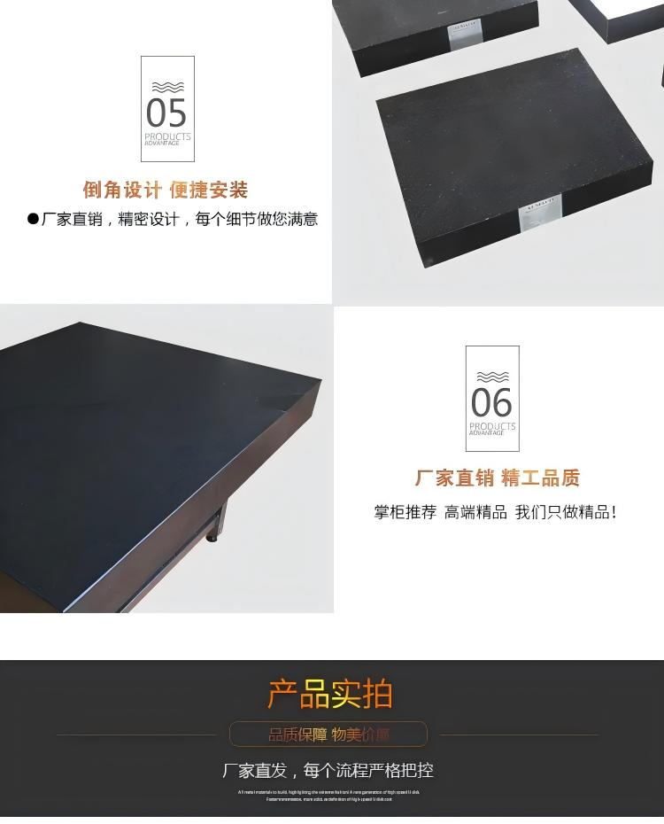 大理石平台采用优质的天然大理石料经机械加工,手工精研而成。黑色光泽,结构精密质地均匀,稳定性好。强度大、硬度高。并具有:不生锈耐酸碱、不磁化、不变型、耐磨性好等优点。能在重负荷及一般温度下保持稳定。