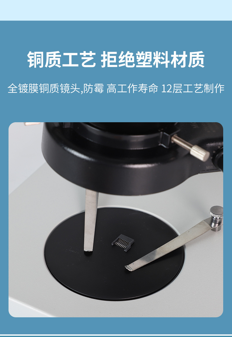 三通观察头,30°倾斜,固定式分光比(双目 :三目 =50:50),瞳距调节范围 50-76mm,固定式目镜筒,带目镜锁紧装置 | |