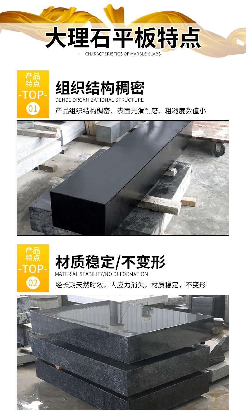 制作工艺大理石平台采用优质的天然大理石料经机械加工,手工精研而成。黑色光泽,结构精密质地均匀,稳定性好。强度大、硬度高。并具有:不生锈耐酸碱、不磁化、不变型、耐磨性好等优点。能在重负荷及一般温度下保持稳定。