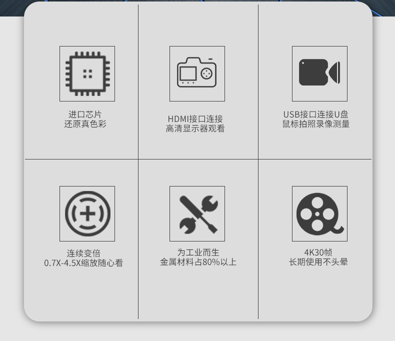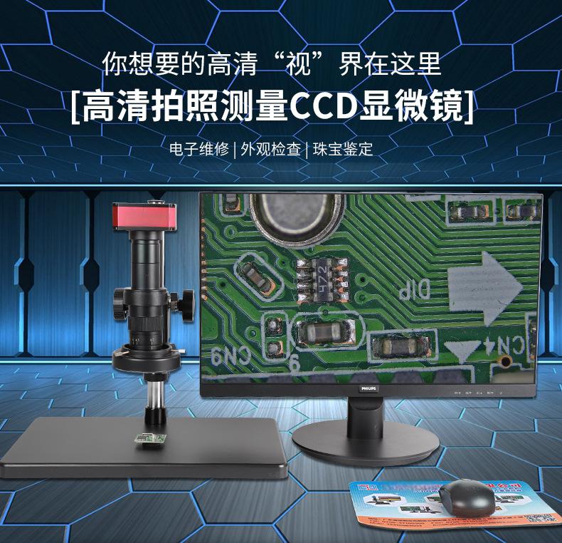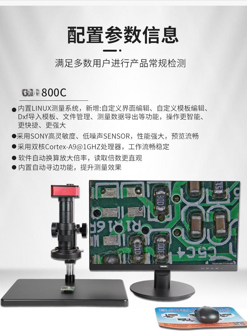 本产品适用于五金、精密元器件、连接器、刀刃、PCB电路板、FPC、纺织品、液晶屏、各种视觉工业检测、医学研究等外观检测及测量。具有成像清晰,立体感强及工作距离长,视野宽阔等特点,专门设计有多种照明装置,LED可调环形光源及荧光环形光源。无需外接电脑主机,直接连接CCD和4K高清显示器,可拍照,录像,保存,测量,导出数据,并且能准确测量出产品的尺寸(测量范围在15mm以内,分辨率为0.001mm)。