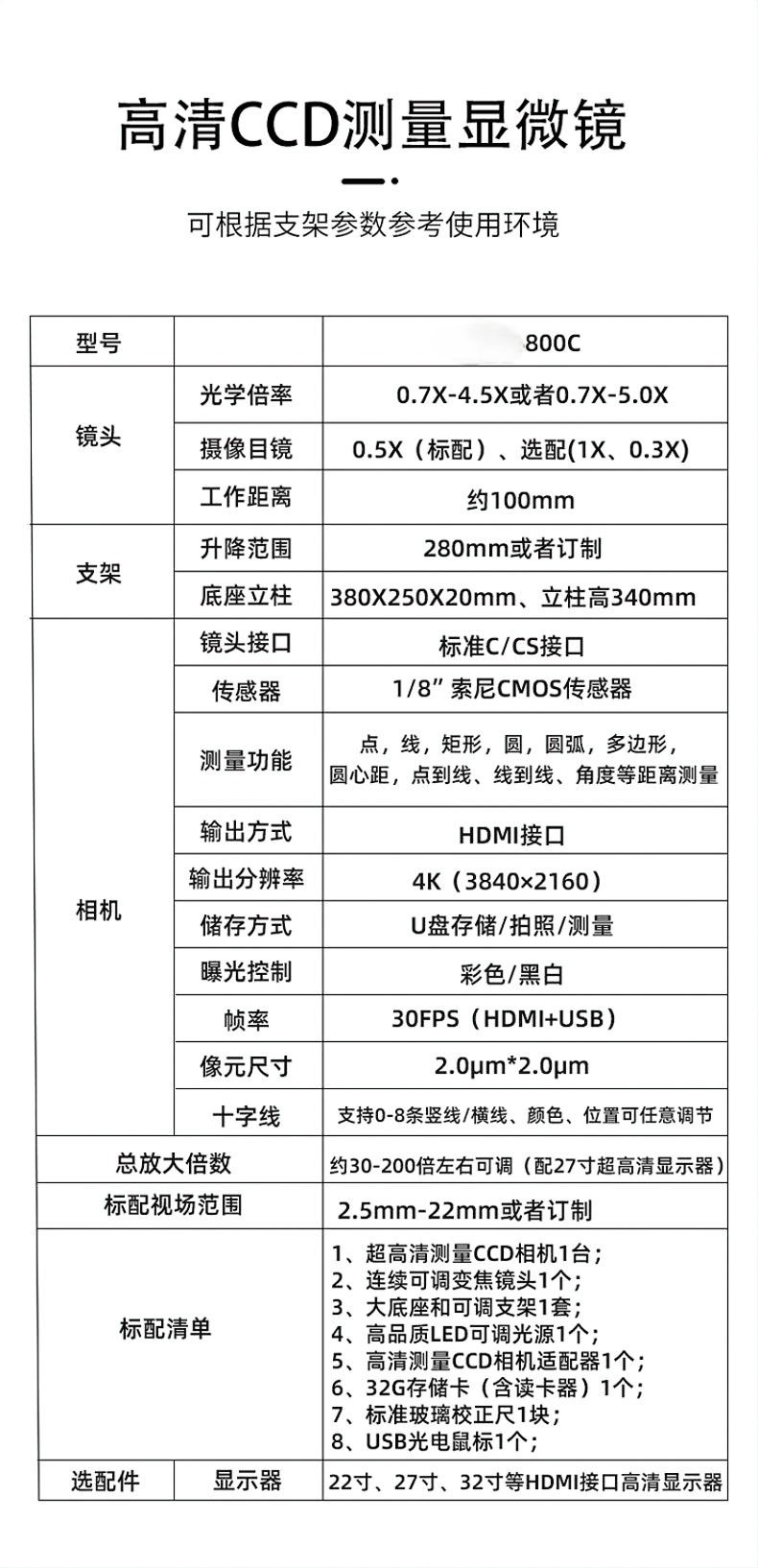 标配清单 | 1、ZZVS-800C超高清测量CCD相机1台; 2、连续可调变焦镜头1个; 3、大底座和可调支架1套; 4、高品质LED可调光源1个; 5、高清测量CCD相机适配器1个; 6、32G存储U盘1个; 7、标准玻璃校正尺1块; 8、USB光电鼠标1个; | |
