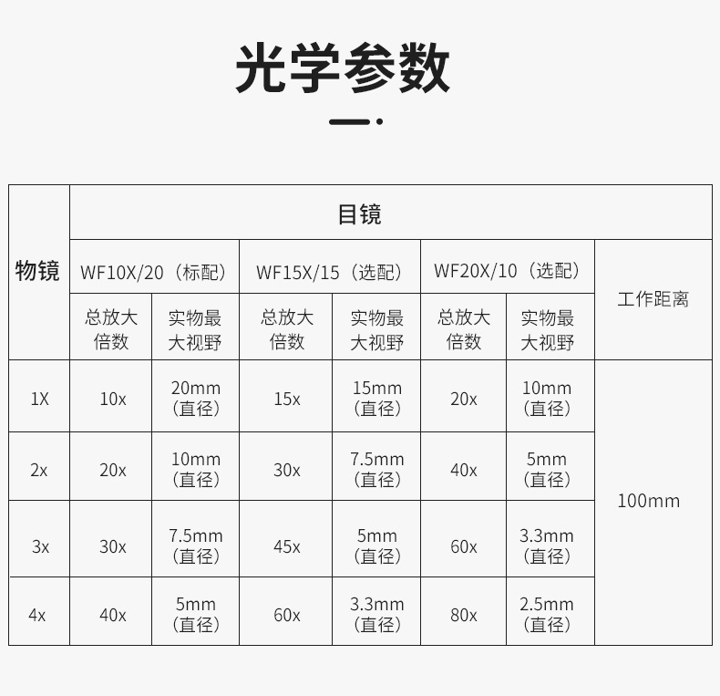 目镜 | 标准配置 | 辅助物镜0.5X | 辅助物镜1.5X | 辅助物镜2X | ||||