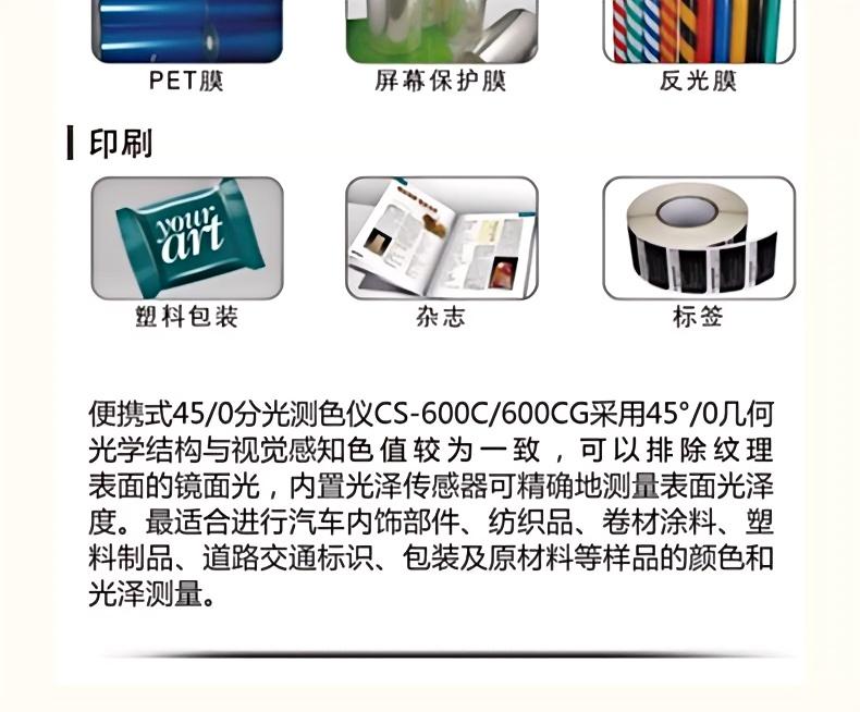 适合进行汽车内饰部件、纺织品、卷材涂料、塑料制品、道路交通标识、包装及原材料等样品的颜色和光泽测量。