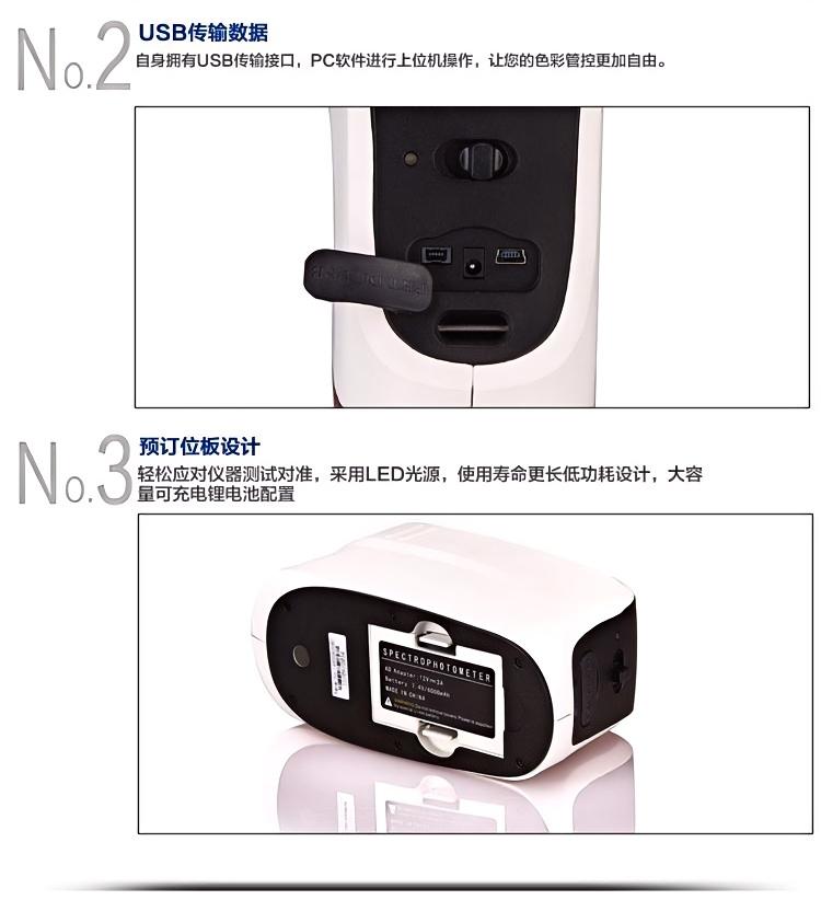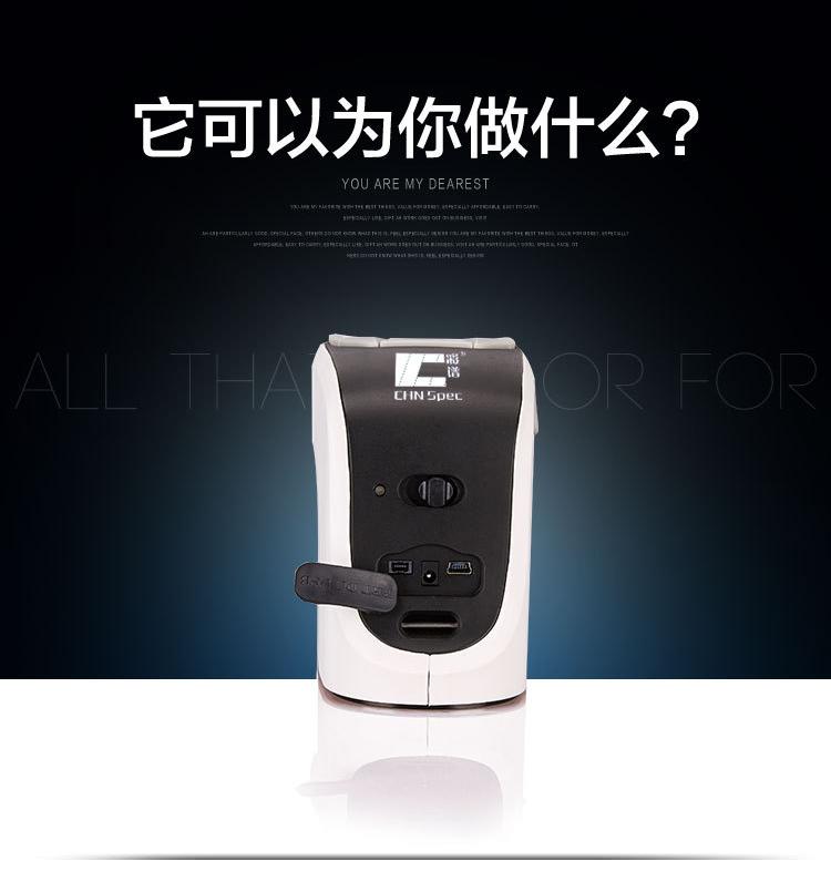 大容量充电锂电池;配置高分辨率的全色真彩大屏;可通过USB和定制蓝牙与pc连接;可配置微型打印机,随时打印测试数据