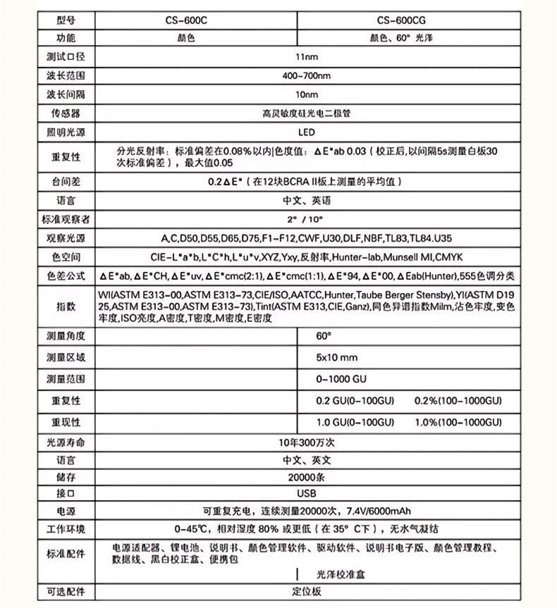 CS-600C/CS-600CG便携式45°/0光学结构的分光测色仪,可实现颜色与60°光泽的同步测量。45°/0几何光学结构与视觉感知色值接近一致,可以排除纹理表面的镜面光,内置光泽传感器可精确地测量表面光泽度。适合进行汽车内饰部件、纺织品、卷材涂料、塑料制品、道路交通标识、包装及原材料等样品的颜色和光泽测量。