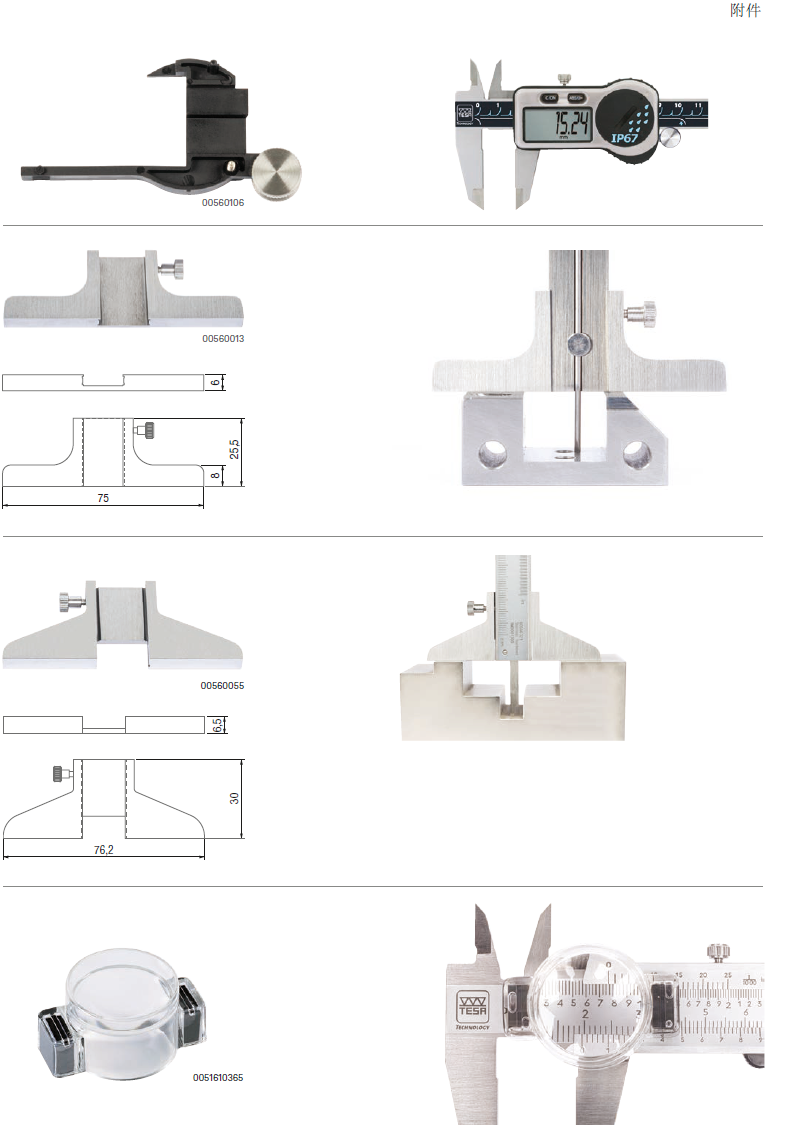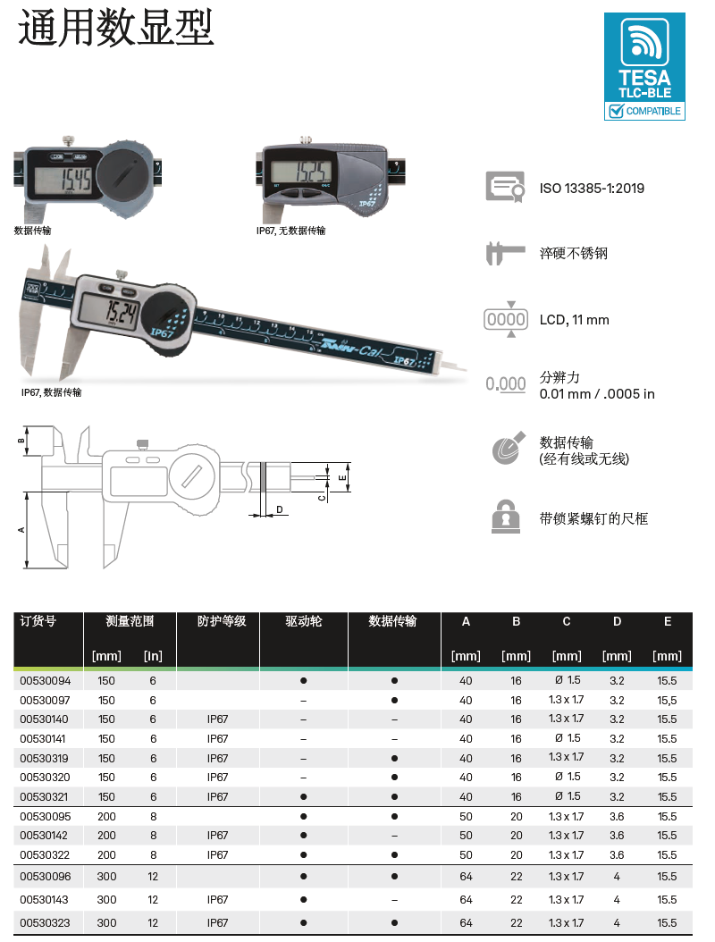 | 00530319 | 通用数显卡尺, 150 mm, TESA-CAL IP67, 方杆, 无拇指轮 |
