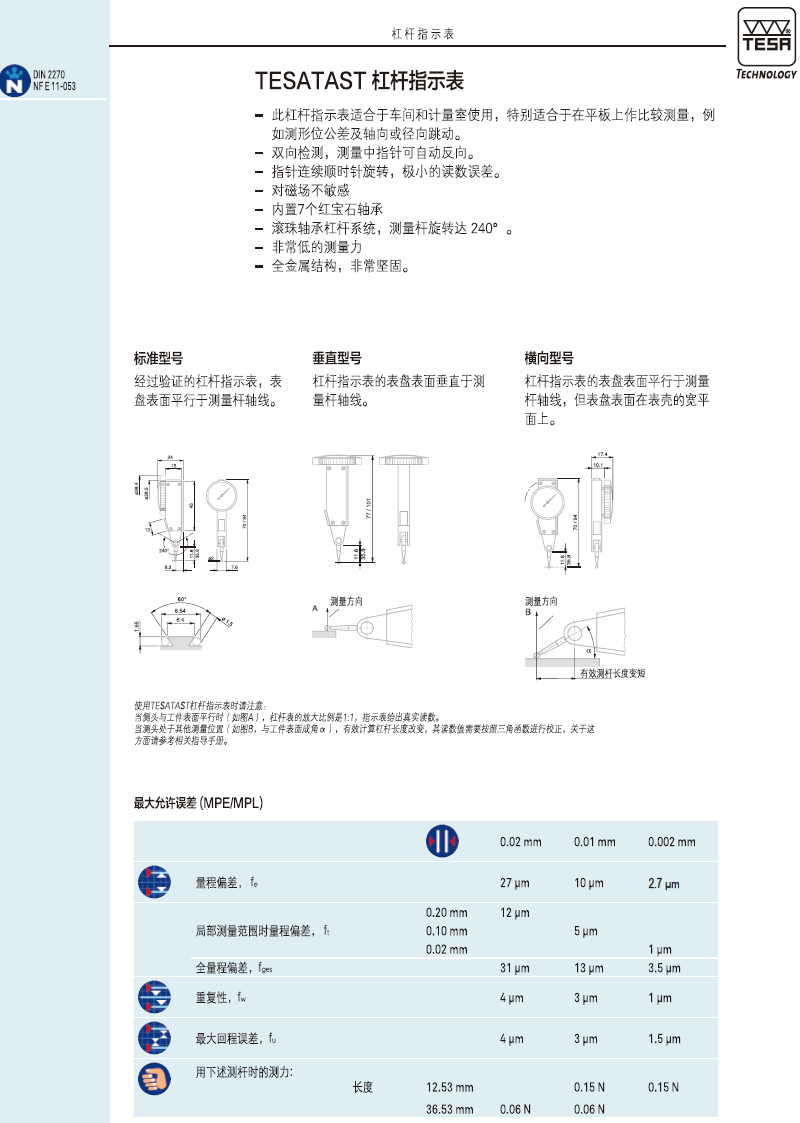 | S18001695 | TESATAST 机械杠杆指示表,标准型, 0,2 mm, 0,001 mm, Ø 38 mm |