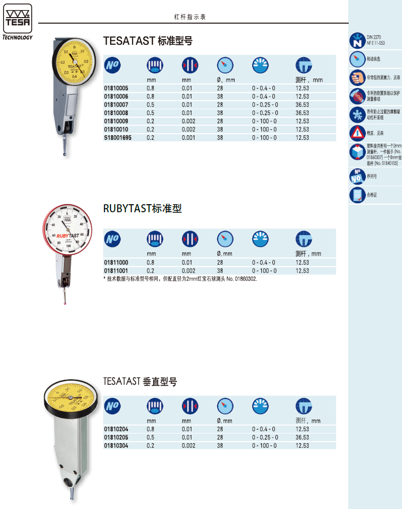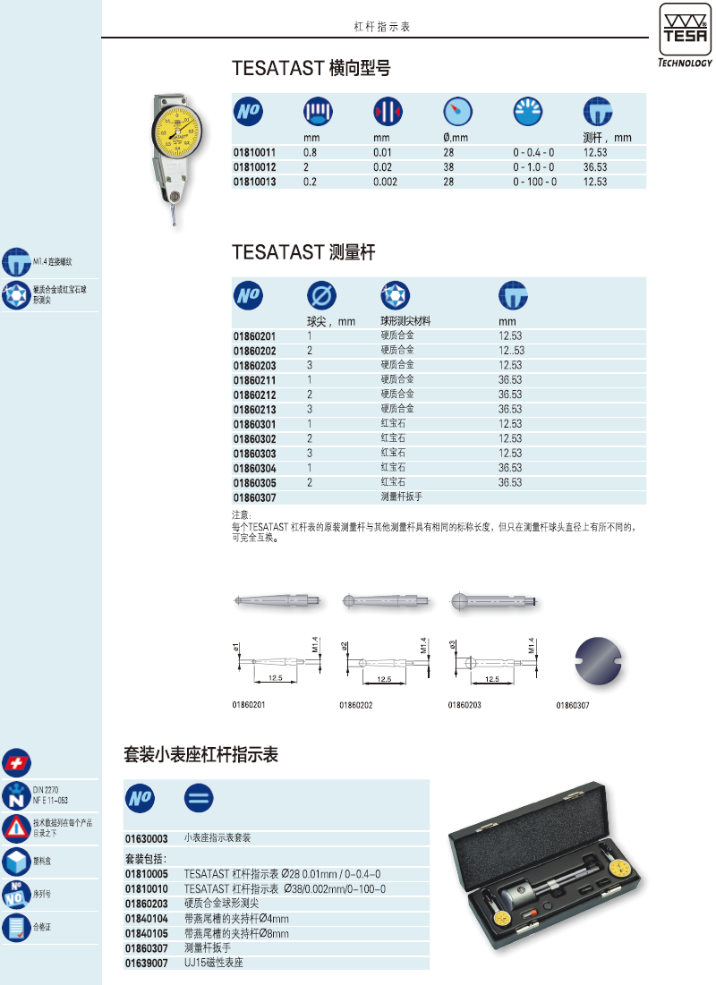 | 01810005 | TESATAST 机械杠杆指示表,标准型, 0,8 mm, 0,01 mm, Ø 28 mm |