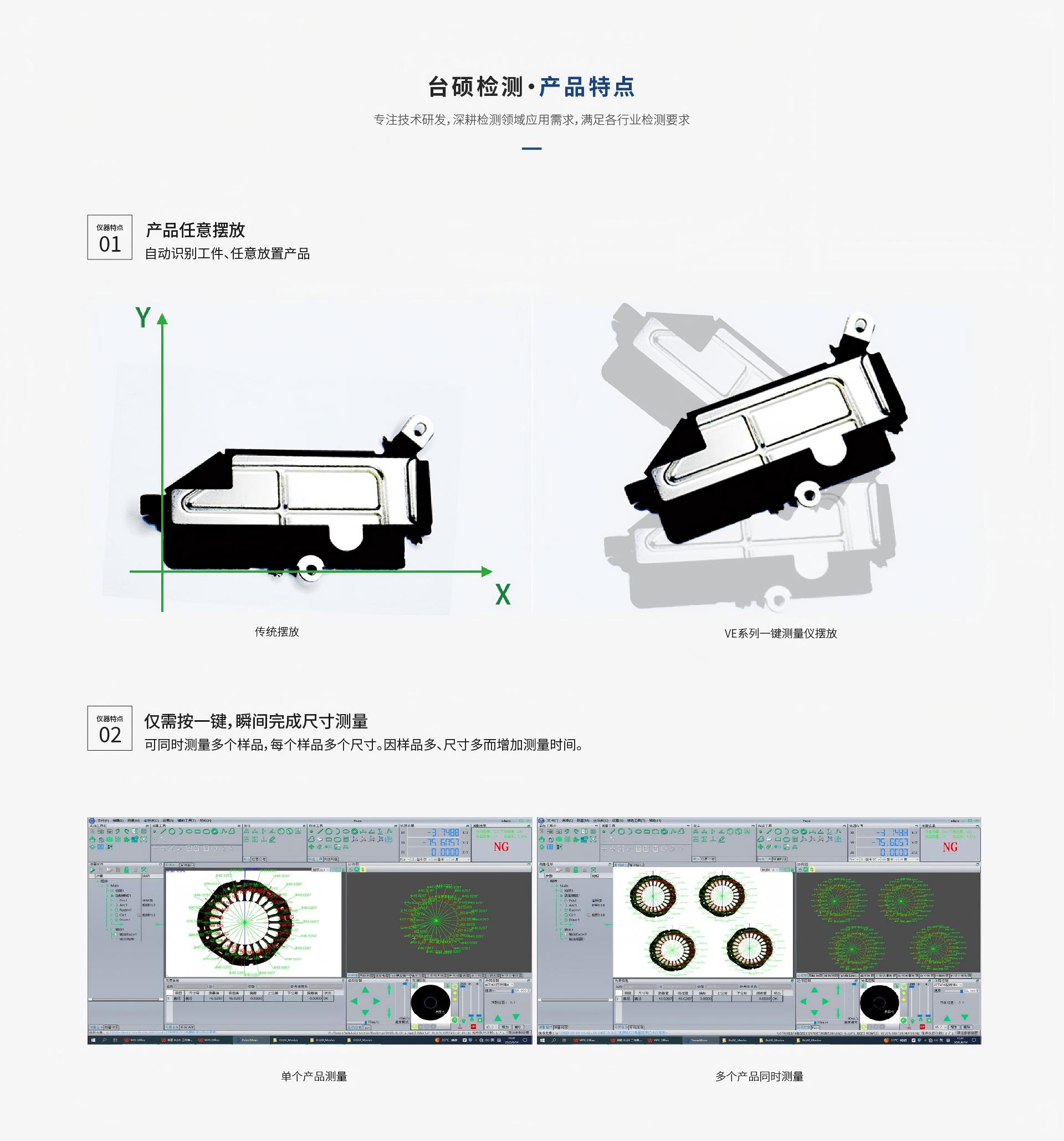 多个工件任意摆放,无需夹具定位,自动识别,批量测量。